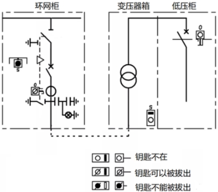 如圖7所示,環(huán)網(wǎng)箱內(nèi)部,阻隔/接地開關(guān)與電纜室門之間的鑰匙聯(lián)鎖,電纜室蓋板翻開后,鑰匙被確定,不能拔出刺進(jìn)到阻隔開關(guān)鎖,即不能操作接地開關(guān);只需蓋板合上,鑰匙才華拔出,去操作接地開關(guān)分閘。而體系視點(diǎn),只需接地開關(guān)合閘,鑰匙才華被取出,去開變壓器箱的門,結(jié)束變壓器檢修,一同低壓斷路器不能合閘。