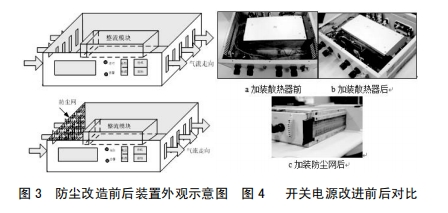 3.2在安裝本體進(jìn)風(fēng)孔加防塵網(wǎng),避免灰塵進(jìn)入安裝內(nèi)部,設(shè)備維護(hù)人員定期對(duì)濾網(wǎng)停止打掃,從而減輕元器件外表覆塵,利于安裝正常散熱,如圖3所示加裝防塵網(wǎng)后開關(guān)電源表示圖。對(duì)安裝施行上述改良后,其改良前后比照如圖4所示。